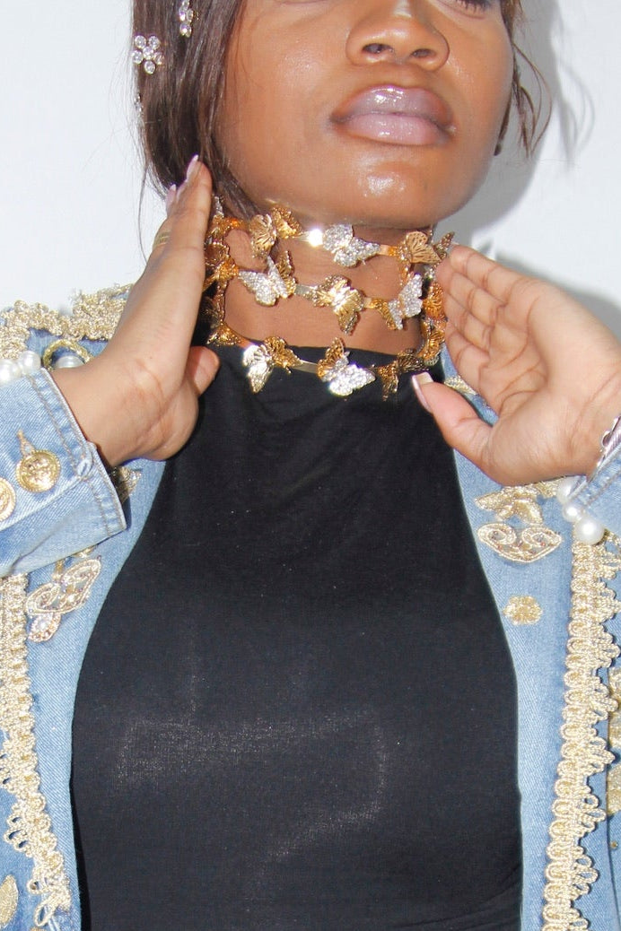 Wear as a dramatic headpiece for editorial moments or transform into a neck cuff for bold evening statements. Pair with sleek silhouettes and let the butterflies do the talking.