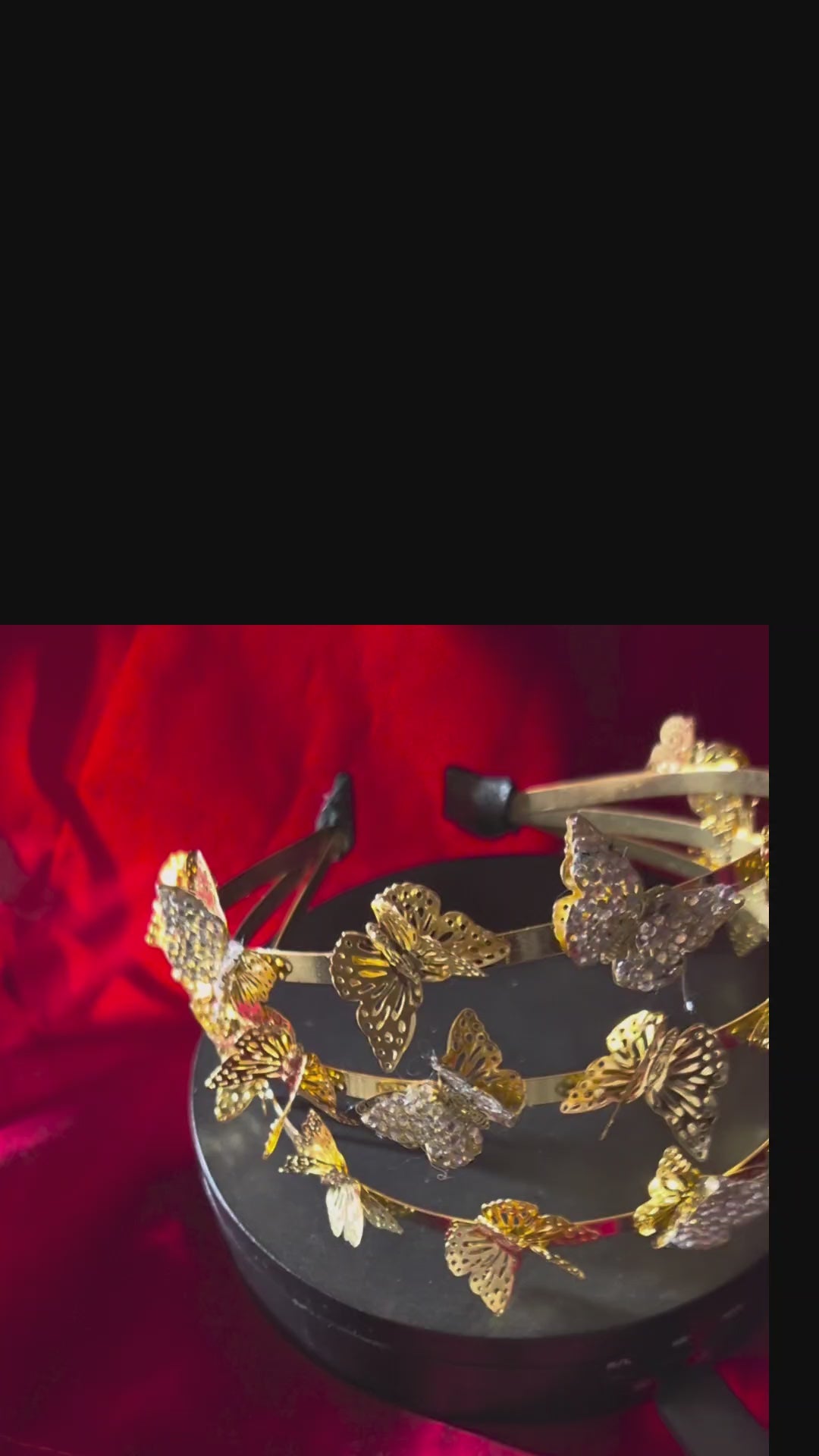 Three gold-tone metal headbands are stacked together, bound and bonded by hand to create a powerful architectural silhouette. Various butterflies is intricately encrusted with tiny Swarovski crystal rhinestones, catching the light with every movement and creating a radiant, floating illusion.
